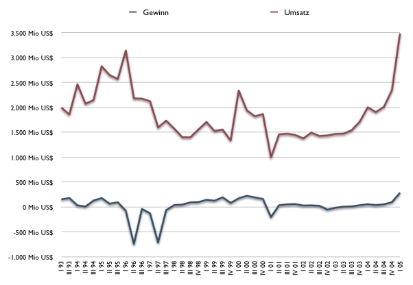 Die nachfolgende Grafik zeigt die Apple Quartalszahlen von 1993 bis 2005.
