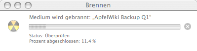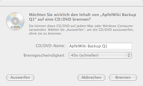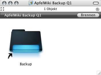 Für das Brennen von Daten auf CDs oder DVDs ist innerhalb des Betriebssystems Mac OS X keine extra Software nötig (es gibt sie aber, siehe die Seite Brennen). Dafür gibt es die Brenn-Ordner, die von vielen Stellen im Finder und aus Programmen heraus angesprochen werden können.