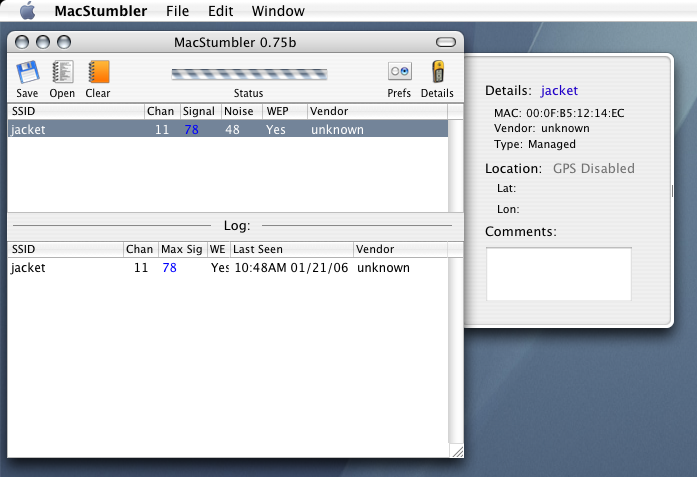 ![]() | MacStumbler Hersteller: korben Aktuelle Version: 0.75b, 2.0 (beta) Preis: OpenSource Webseite: http://www.macstumbler.com/ Direkter Download (PPC) (Inoffizielle Universal Version siehe Beschreibung unten) |