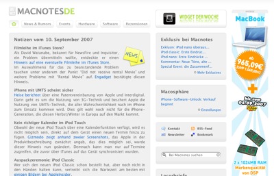 Werktäglich liefert die Rubrik "Notizen vom..." einen Überblick über die wichtigsten Nachrichten. Andere regelmäßige Rubriken sind z.B. "Widget der Woche", "Betthupferl" (ironische Betrachtungen der Mac-Szene), "Pixelschubser" (Wallpaper, Icons etc.), "Tech-Talk" (lesenswerte Hintergrundinfos zu technischen Fragen rund um den Mac) und der Macnotes-Podcast.
