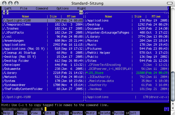 Midnight Commander (MC) ist ein Open Source Norton Commander Klon für das Terminal. MC läßt sich unter Mac OS X via Fink oder DarwinPorts installieren