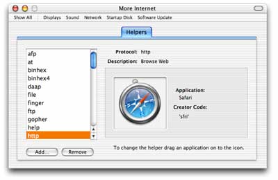 More Internet ist eine pfiffige Erweiterung der Systemeinstellungen, ein sog. System-Preferences-Pane. Das Feld ermöglicht es InternetConfig anzugeben, welche Software bei einem bestimmten Internetprotokoll geöffnet werden soll. Beispielsweise öffnet es bei einer URL in der Art webcal://... Apples iCal. Möchte man dies nicht, hat man die Möglichkeit in More Internet ein anderes Programm anzugeben.