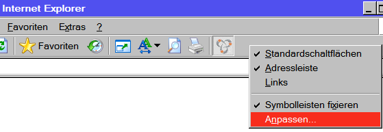 - * Sollte das Bonjour Symbol nach der Installation im Internet Explorer nicht zu sehen sein, Rechtsklick in die Symbolleiste, Anpassen wählen und das Bonjour Symbol einfügen.