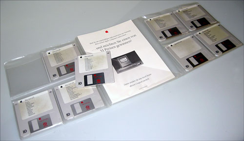 Oben links: Zwei Betriebssystemdisketten, Oben rechts:Druckerdiskette, Dienstprogramme, Unten links:Zeichensätze, Hilfsprogramme, Unten rechts:Quicktime, Intro, in der Mitte ist ein Gewinnspielcoupon. Unten rechts auf jeder Diskette ist ein kleines Warnicon mit der Beschriftung 400K/800K, damit man diese Disk nicht in alten Diskettenlaufwerken verwendet. |