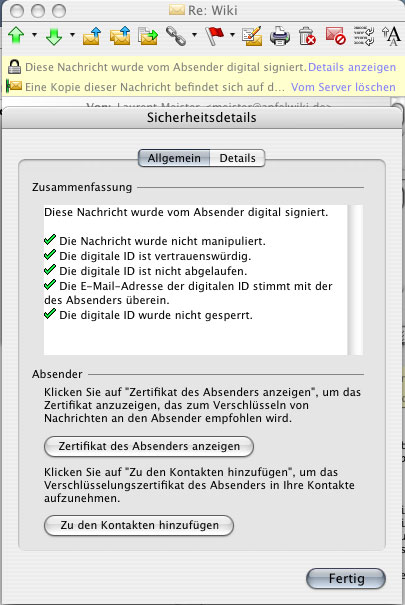 Entourage zeigt den Status der Mail nach dem empfangen an. Enthält ein Mail ein Zertifikat eines Dritten, kann dieses Zertifikat dem eigenem Entourage-Adressbuch hinzugefügt werden. Dazu in der gelben Statuszeile auf Details anzeigen klicken und im folgendem Dialogfenster Sicherheitsdetails den Button Zu den Kontakten hinzufügen auswählen.